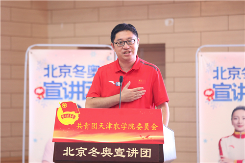 宣讲员个个感人至深、振奋人心的冬奥故事,深深触动着在场每一位天农师生的内心,掌声经久不息。有参加韩国平昌冬奥会闭幕式北京8分钟表演的南开大学青年教师郭露阳,以精湛的表演向全世界发出来自中国的诚挚邀请。有结下“冰雪良缘”的北京市东城区龙潭街道龙潭北里社区副主任王波,分享了自己2017年取得北京大众滑雪六级证书,并以冰雪为媒收获爱情,与先生共同从滑冰爱好者到滑雪战队首批队员,致力弘扬奥运和平、发扬志愿者精神的动人故事。有收集冰雪剪报20年、普及冬奥文化的中国铁路北京局集团有限公司塘沽站工程师王蓬,他参加《冬奥达人答》,创作冰、雪诗词飞花令,用自己的全部热情普及冰雪知识。有坚守幕后、打造奥运“超级现场”的中国联通北京分公司冬奥办公室主任张嘉,为我们讲述了《智慧冬奥联通未来》的幕后故事。有我国第一代滑雪医生中国中医科学院西苑医院医生付妍,为我们展示了一名滑雪医生炼成背后的执着坚守和辛苦付出。有自由式滑雪空中技巧世界冠军李妮娜,对运动的热爱和坚持不懈的精神早已是她人生的金牌,索契冬奥会后,她依然留在了离冬奥最近的地方,为北京冬奥组委运动员委员会贡献力量,在2015年7月31日的吉隆坡,李妮娜作为运动员代表进行全英文申奥陈述:“我把青春奉献给冬奥、奉献给我的国家。”她用《两块“金牌”的故事》讲述冠军背后的体育故事、传递中国体育精神。