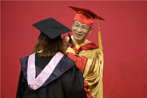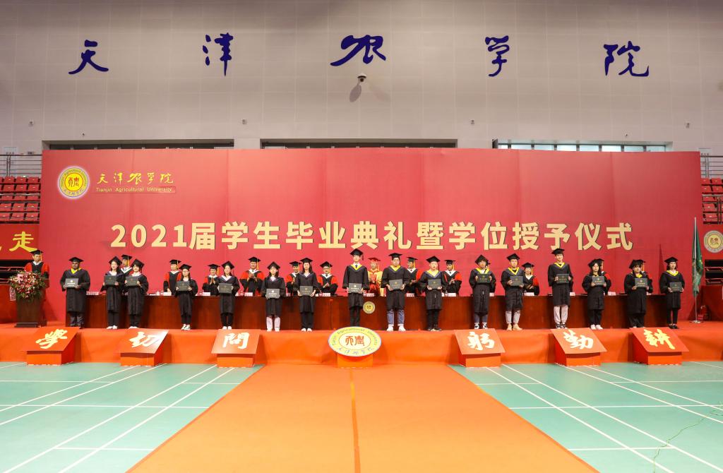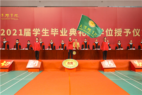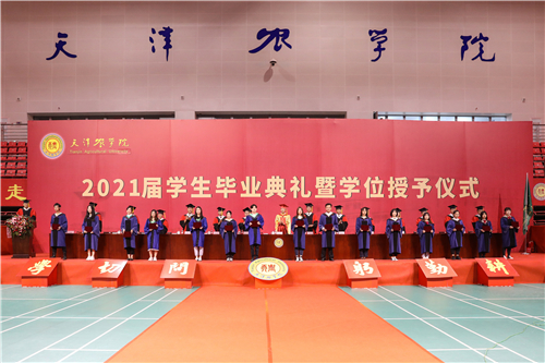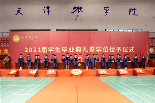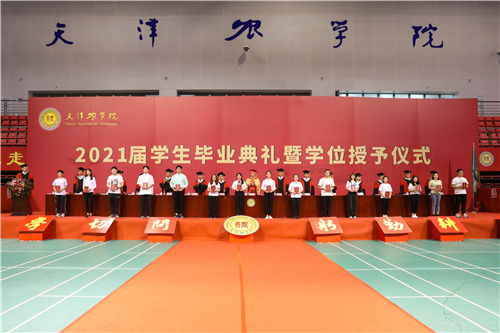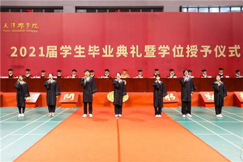 主席台领导为高职毕业生代表颁发毕业证书,为获得学士学位的毕业生代表和获得硕士学位的毕业生颁发毕业证书,并授学士礼、硕士礼,同时,向“大学生成才奖”获奖学生代表颁发荣誉证书。典礼庄重热烈,帽穗从右边拨到左边,象征着毕业生将从天农校园出发,踏上新的人生征途。