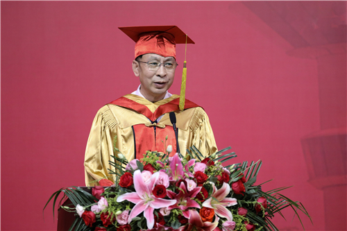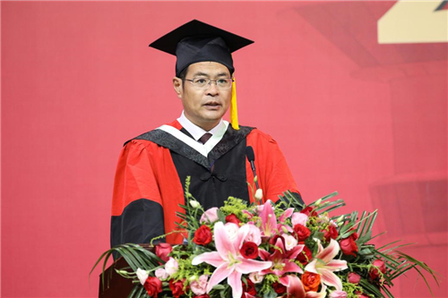王延文在讲话中代表学校向全体毕业生及家长致以最热烈的祝贺。他肯定了毕业学子们的学习成果,赞扬了毕业生们在疫情、援疆和社会志愿服务中的担当作为,交出了更加精彩的毕业答卷。他指出,立足党的百年历史新起点、统筹中华民族伟大复兴战略全局和世界百年未有之大变局,我们国家既面临前所未有的风险挑战,又具有众多的发展机遇,每个人的成长将与祖国发展同频共振,生逢其时。王延文向毕业生们提出了三点殷切希望:一是不惧风雨,努力秉持一颗恒心、平常心和勇敢的心,常问初心所在,持之以恒,行稳致远;二是谦和大气,与人为善,合作共赢,争做像抗疫英雄那些负重前行的人;三是把握大势,敢于担当,善于作为,心怀“国之大者”,为服务国家富强、民族复兴、人民幸福贡献力量。他再次深情嘱托毕业生要不断锤炼本领,立大志、明大德、成大才、担大任,自觉将自身发展融入到实现中华民族伟大复兴的宏伟事业之中,以“百年接力,强国有我”的激情,为党和国家建功立业!