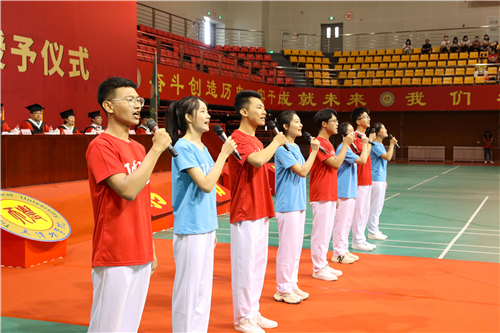 经济管理学院会计学专业毕业生杨芸艺带领全体毕业生郑重宣誓,担当社会责任,胸怀天下,为实现中华民族伟大复兴的中国梦不懈奋斗。毕业是人生旅程的新起点,为表达母校的诚挚祝福,由大学生艺术团师生为全体毕业生倾情演唱《我和2035有个约》。