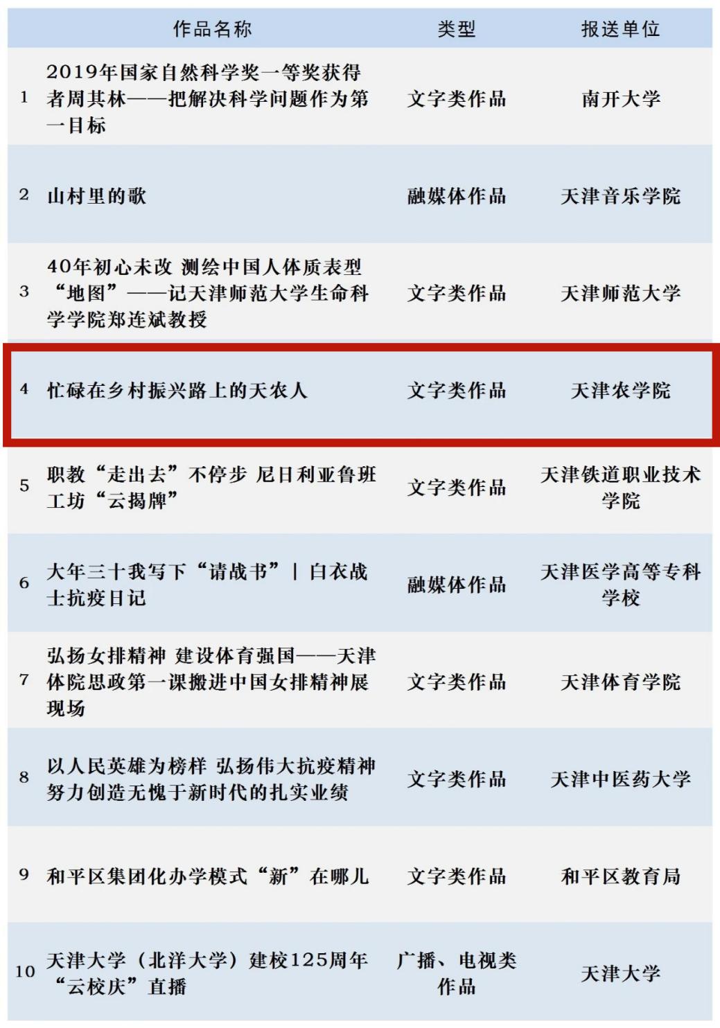 2020年度天津市“十大教育新闻作品”评选活动由市教育两委组织开展,通过自主申报、专家评审、网上公示,最终评定包括今年会官网报送的《忙碌在乡村振兴路上的天农人》在内的10个作品为2020年度天津市“十大教育新闻作品”。