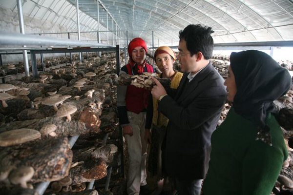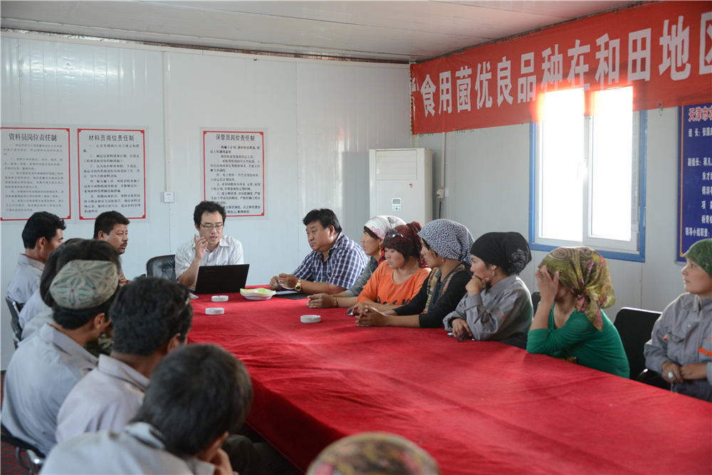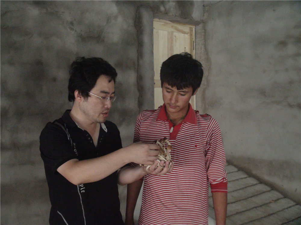 新疆策勒县曾是国家级贫困县,少平原,多戈壁,耕地紧缺且干旱缺水,农业主要以粮食作物、果树和药用植物等传统产业为主,结构单一,经营方式粗放,资源利用率和土地产出率较低。2010年至2018年,班立桐教授作为食用菌援疆项目主要技术负责人在策勒县开展技术援疆工作。如何让喜欢潮湿阴暗的蘑菇在这气候多变、干燥少雨的茫茫戈壁“安家落户”、“生根发芽”?班立桐带领技术人员探查地势地形,调研当地人文与气象资料,选择适宜的园区建设地点。经过无数日日夜夜的分析、讨论,反复设计试验与改进完善,终于建造出性能优良的适用于在戈壁滩上食用菌栽培的专用温室,并获得国家授权实用新型专利。他还结合当地气候条件、农业环境、民族消费习惯及当地农业废弃物资源可利用率,筛选确定适于当地栽培的食用菌品种,并充分利用戈壁滩的棉籽、棉杆、畜禽粪便等原料进行配套生产技术的研发。