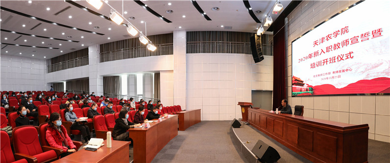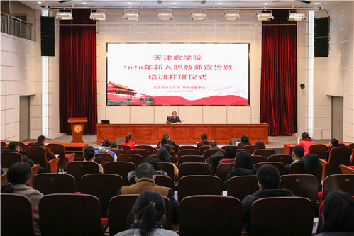 张民代表学校对新入职教师加入天农大家庭表示欢迎。新入职教师佩戴校徽,在党委教师工作部部长刘铁玲的领誓下,面对国旗、校旗庄严宣誓。政府特殊津贴专家、园艺园林学院田淑芬研究员作为教师代表发言,水利工程学院教师张茜作为新入职教师代表发言。
