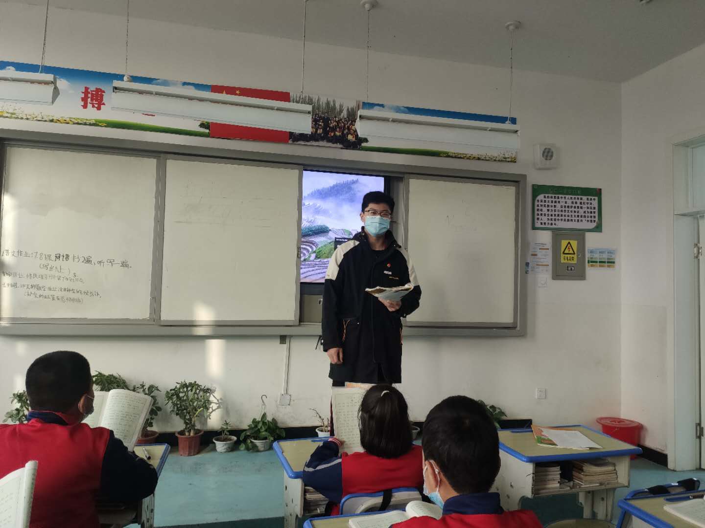 他们在关心关爱中,播撒着民族团结的种子。支教团成员古昕月同学所在的支教班有一名学生因脚受伤而行动不便。当该学生需要上洗手间时,她每次都主动抱着学生去,这一抱就是好几天。“虽然我身体单薄,但是在抱起小女孩的时候,我觉得身上充满着爱的力量。”她目光中充满着关爱。支教团成员吴卓倩在谈到自己来支教前的感受时表示,“援疆支教是埋在我心里的一颗种子,我热情地、悉心地浇灌,希望它能开出绚烂的沙漠之花。”接着,她说起支教过程中的一个小故事,让我们深深感到民族团结一家亲的真挚情感。“一天早上,我一直在忙着测量登记同学们的入园体温,这个时候有一双稚嫩的小手捧着已经剥好皮的橘子用着不太标准的语调小声地对我说‘给你,老师’,喜悦溢于言表。在接过橘子的那一刹那,我的心里暖暖的,久久难以平缓。”