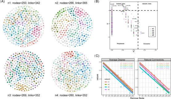 通过α -多样性指数(Shannon、Simpson和Richness)和β -多样性指数(“Bray - Curtis”距离)、总系统发育分支长度(系统发育距离,PD),Mantel测试、Spearman相关性分析和线性回归等方法,分析微生物群落组成和多样性;利用INAP平台和SparCC方法构建微生物共现网络,分析其拓扑结构、关键节点(模块枢纽和连接器)以及网络稳定性构建生态网络共现模式;利用中性群落模型和ICAMP模型推断细菌群落组装机制。