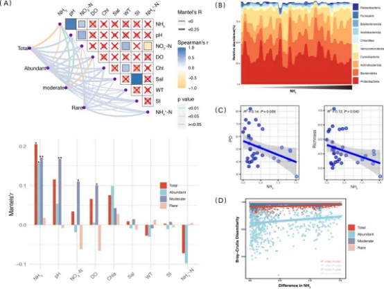 近日,水产学院乔之怡团队与中国科学院水生生物研究所霍达博士合作在《Microbiology Spectrum》(IF:3.700)期刊上发表学术文章“Assembly process and co-occurrence network of microbial community in response to free ammonia gradient distribution ”的文章,研究生孙圣杰为第一作者。该研究通过扩增子测序技术,系统地研究了引滦工程流域中微生物群落及其亚群落(丰富、中等和稀有)对游离氨(NH3)梯度分布的响应的动态、共现网络和组装过程。