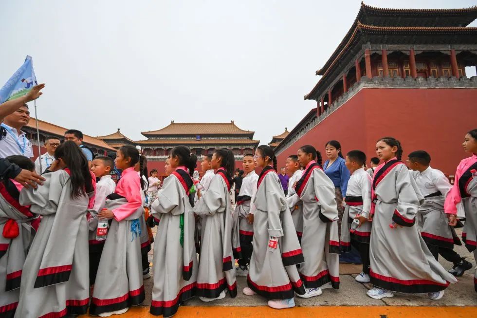 2023年5月31日,来自玉树州的孩子们在北京故宫博物院外排队等候进入参观。新华社记者 陈晔华 摄