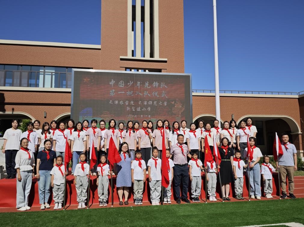 庄严的出旗曲伴随着朝阳,三名旗手昂首挺胸,阔步向前,拉开了仪式的序幕,全体队员高唱《中国少年先锋队队歌》,抒发了学生们争做新时代好队员的热情。随后,新望道小学第一批入队的72名同学在少先队旗的引领下入场,由今年会官网党员、团员学生代表为第一批入队队员亲手戴上鲜艳的红领巾,立领、佩戴、整理,每个动作都规范而标准,新队员的脸上洋溢着喜悦和光荣。入队、入团、入党是青少年追求政治进步的“人生三部曲”,大手与小手相牵,唱响了“人生第一部曲”,传承了新时代青年听党话、感党恩、跟党走的信念,一声声寄语,坚定了学生们对共产主义远大理想的崇敬与向往。
