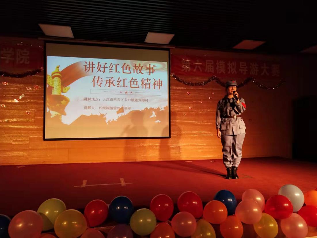 围绕“讲好红色故事,传承红色精神”举行了模拟导游大赛。经过初赛选拔,最后有8名同学进入决赛展示。他们利用多媒体,通过生动形象且细致的导游语言和大方得体的举止,带大家深入了解了很多红色革命圣地。从具有重大纪念意义的平津战役纪念馆到拥有壮丽史诗的辛口镇第六埠村的长征路,从富有悠久历史的大沽铁钟到蜿蜒曲折的山城重庆红岩,不一样的故事,传递出同样的精神,红色血脉绵绵传承。