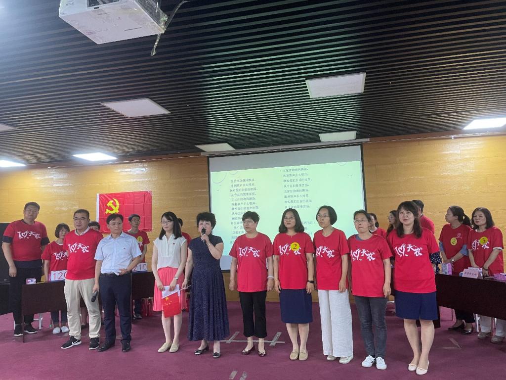 活动伊始,院党委书记杨秀红同志带领全体党员面向党旗庄严宣誓重温入党誓词,随后歌曲《没有共产党就没有新中国》应声响起,在大家共同演唱下活动拉开帷幕。所属五个党支部书记背向屏幕随机叫停选定参赛选手,现场组队成功后正式进入比赛环节。本次比赛由必答题和抢答题组成,选手每人从信封中抽选一题作答,指定四本书目中节选文段及猜红歌作为抢答题,在紧张激烈的角逐中评选出一二三等奖,党委班子成员为参赛选手一一颁奖,最后以大家共同演唱《歌唱祖国》结束。