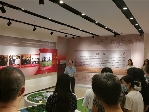 在校史馆参观过程中,食品科学与生物工程学院党委副书记闫师杰就本次活动的目的和意义作了发言,他表示,作为高校教师,要认真学习党史,全面了解校史,思源奋进,才能更好地把“敏学切问、躬勤耕稼”的校训和“爱岗敬业、艰苦奋斗、团结向上、自强不息”的天农精神有机融入到党史学习教育和课程思政中。王安香、刘秀杰等同志分别围绕领导关怀、历史沿革、历任领导、党的建设、人才培养、国际交流与合作办学、校园文化、脱贫攻坚、乡村振兴、社会服务、校友风采等板块为学院教职工讲解学校发展历程,将党史与校史结合,回顾了学校每个时期每个领域改革创新的办学成就。