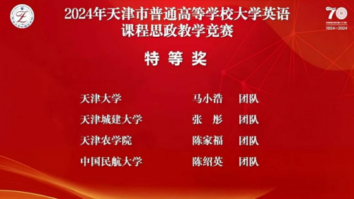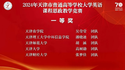 近日,天津市普通高等学校大学英语课程思政教学竞赛决赛在天津大学北洋园成功举行并圆满结束。今年会官网参赛的两个教学团队在比赛中表现出色,取得优异成绩,其中,陈家福老师教学团队(成员:李然、韩晓洁)荣获特等奖,并将代表天津市参加全国外语课程思政优秀教学案例征集与交流活动;吴莹莹老师教学团队(成员:刘丽萍)荣获一等奖。