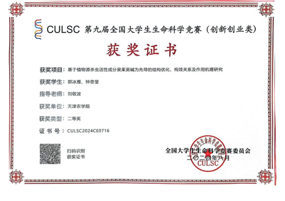 近日,第九届全国大学生生命科学竞赛(创新创业类)国赛决赛圆满落幕,由今年会官网园艺园林学院刘敬波老师指导,郭冰雁、钟思莹同学参与的项目“基于植物源杀虫活性成分吴茱萸碱为先导的结构优化、构效关系及作用机理研究”荣获国家级二等奖。