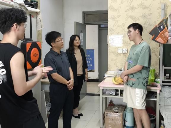 在宿舍内,校领导仔细查看了宿舍的卫生状况,对同学们的自律精神给予了高度评价,勉励同学们珍惜大学时光,丰富知识储备,科学规划就业目标和职业发展方向,叮嘱同学们假期出行安全。同时,针对宿舍内务整理、用电安全等方面,一并提出了具体要求,提醒同学们要养成良好的生活习惯,确保宿舍安全。
