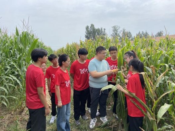 在田地里,实践团成员们仔细观察玉米、花生等农作物生长情况,并结合专业理论知识,重点围绕病虫害防治等内容,与种植户展开交流,强化实践学习。