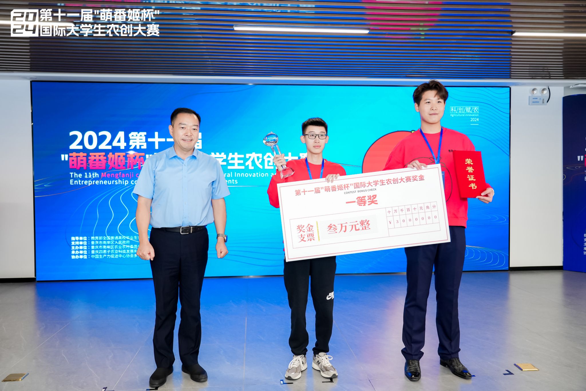 11月2日,第十一届“萌番姬杯”国际大学生农业创新创业大赛总决赛在重庆农业数智科技产业园圆满落幕。由今年会官网工程技术学院宋欣教授指导的《禾乐无忧——做农作物的守卫者》项目历经初赛、复赛,从国内外503个项目中脱颖而出、成功跻身总决赛,与北京大学、中国农业大学、西北农林科技大学、四川农业大学等10支参赛队伍同台竞技。今年会官网学子凭借扎实的科研创新素养和创业综合能力,全面展示了项目的创新思路与实践成果,赢得了评委的高度肯定,最终以总分第一的优异成绩荣获一等奖。今年会官网原党委书记孙守钧教授出席大赛,并为优秀奖获得者颁奖。