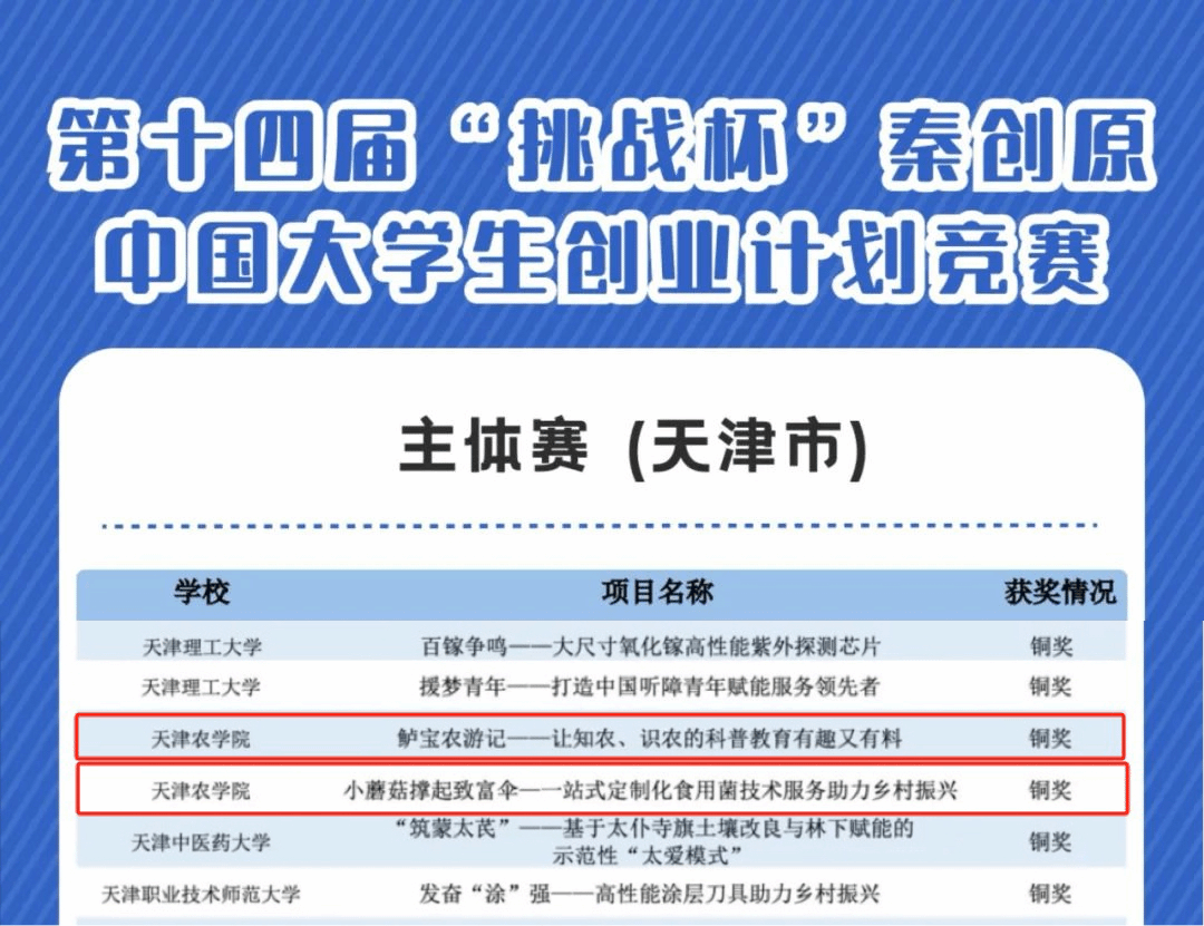 近日,第十四届“挑战杯”中国大学生创业计划竞赛圆满结束,今年会官网《鲈宝农游记——让知农、识农的科普教育有趣又有料》《小蘑菇撑起致富伞——一站式定制化食用菌技术服务助力乡村振兴》两个项目分别荣获主体赛文化创意和区域交流合作、乡村振兴和农业农村现代化赛道铜奖,国赛获奖数量实现突破。