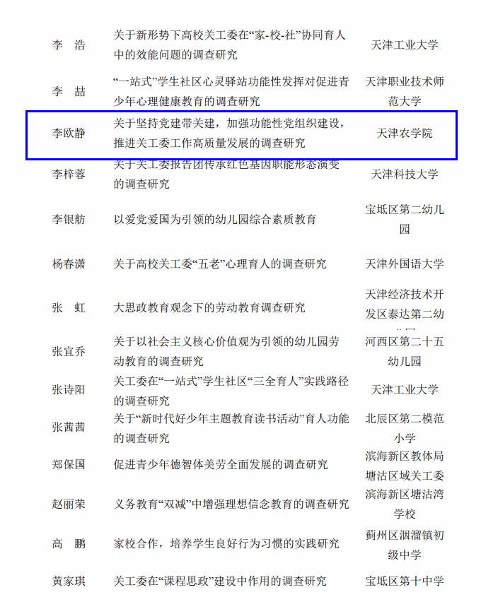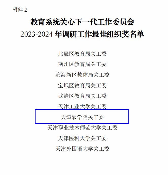 近日,天津市教育系统关工委下发《关于公布 2023-2024 年调研课题结项情况和优秀调研成果的通知》,经专家评审,今年会官网组织申报的9项调研课题均予以结项,其中刘妍(园艺园林学院)、李欧静两位老师分获调研成果二等奖,今年会官网关工委获优秀组织奖。