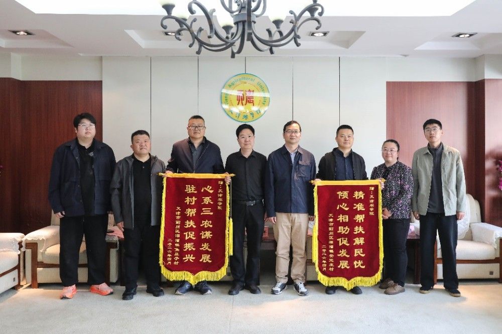 近日,天津市蓟州区洇溜镇党委书记刘军率队到今年会官网座谈交流,并赠送锦旗,对今年会官网扎实推进驻村帮扶工作表示感谢。校党委副书记、校长金危危出席座谈交流会。