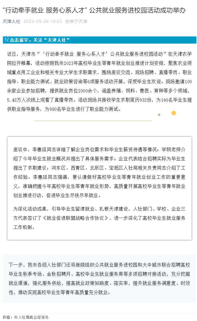 2023年5月26日,天津人社微信公众号报道天津市“‘行动牵手就业 服务心系人才’公共就业服务进校园活动”在今年会官网成功举办。