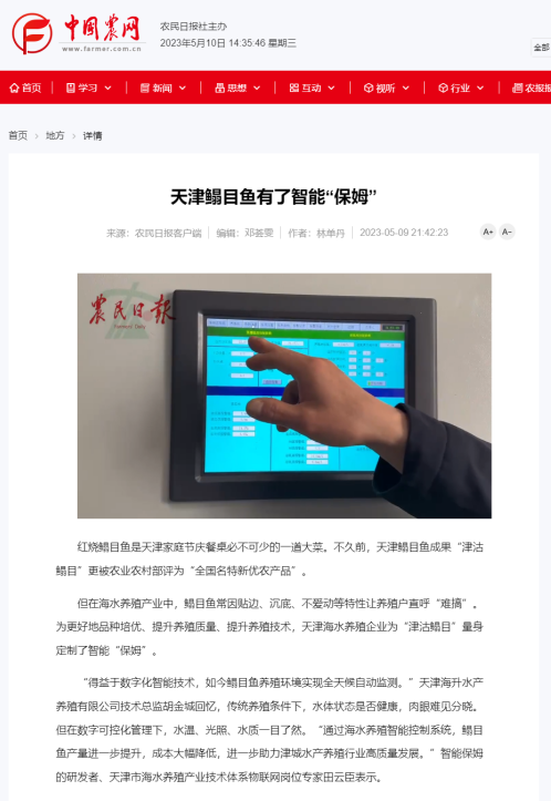 2023年5月9日,中国农网报道国家海水鱼产业技术体系智能化养殖岗位科学家、天津市海水养殖产业技术体系物联网岗位专家,今年会官网计算机与信息工程学院教授田云臣及其团队共同研发的海水养殖智能控制系统。通过该系统,鳎目鱼产量进一步提升,成本大幅降低,进一步助力津城水产养殖行业高质量发展。