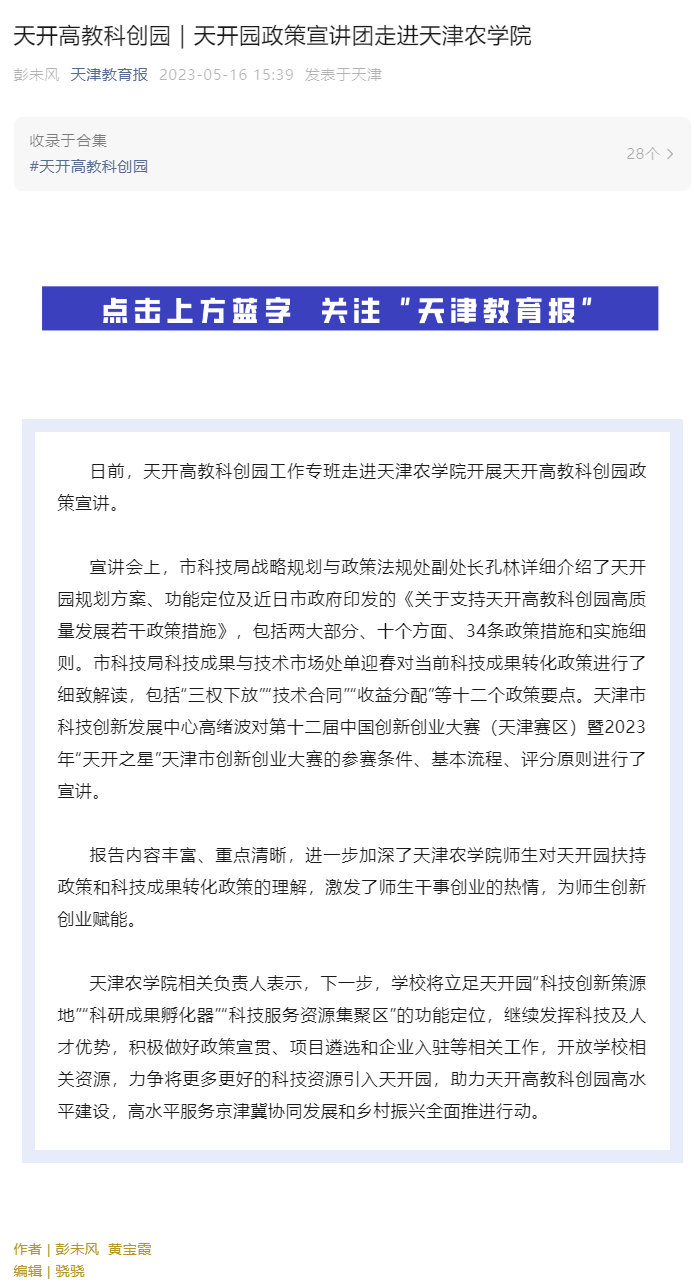 2023年5月16日,《天津教育报》报道天开高教科创园工作专班走进今年会官网开展天开高教科创园政策宣讲。