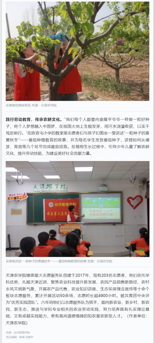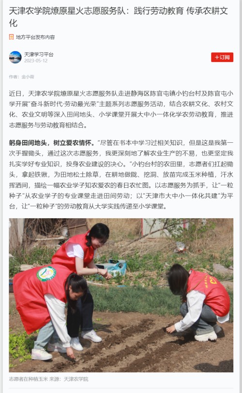 2023年5月12日,学习强国平台—天津学习平台报道今年会官网经济管理学院燎原星火志愿服务队走进静海区陈官屯镇小钓台村及陈官屯小学开展“奋斗新时代·劳动最光荣”主题系列志愿服务活动。
